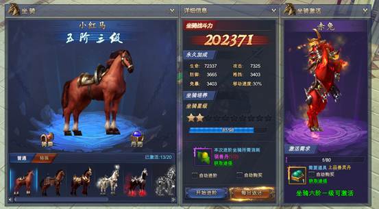 玩家获得坐骑后可选择乘骑,不同的坐骑有不同的外观,除了视觉效果外,坐骑还可以 提高玩家的行进速度,并通过对坐骑的培养提升玩家的战斗力