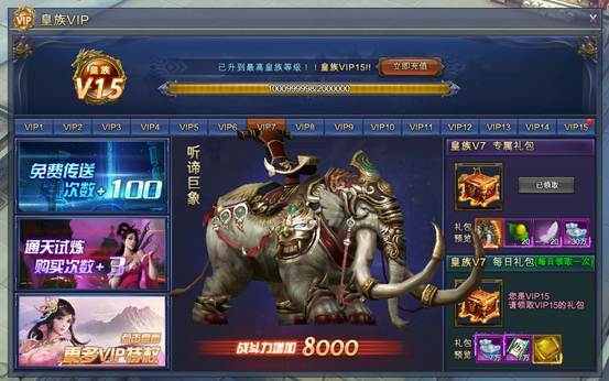 成为VIP用户后,除相应的特权外,还可以获得对应的神兵、时装、坐骑、法宝等特 殊奖励
