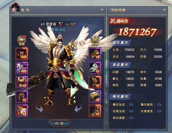 游戏中点击右下角的角色图标即可打开角色信息界面查看角色的形象、装备、神兵、 翅膀、属性,成就入口、称号入口和时装入口等信息