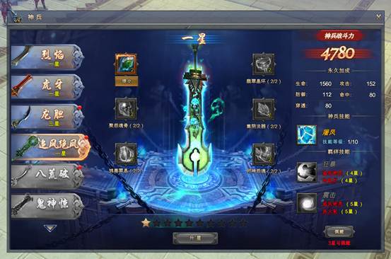 神兵拥有2个羁绊技能,需要相应的法宝和神兵达到足够的星级后,才能使用;