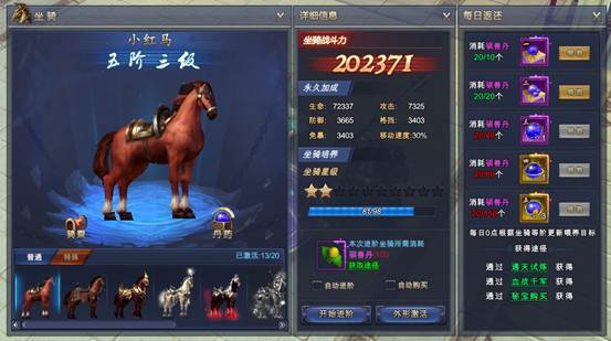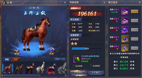 玩家可通过使用【驯兽丹】提升普通坐骑的星级,同时还可以通过【骑灵丹】喂养 提升普通和特殊坐骑的喂养阶级,以达到提升整体坐骑战力的目的;